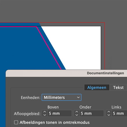 Bij ons geldt "voor zo goed als alle producten" dat er zonder afloop aangeleverd mag worden. Jij levert dus een bestand op netto formaat aan. Hierdoor hoef jij geen rekening te houden met de bleed bij verschillende materialen en producten.
