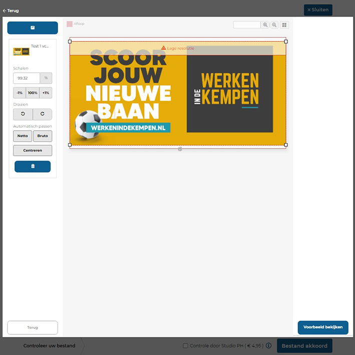 Indien jouw bestanden niet voldoen aan de juiste aanleverspecificaties zal jij een foutmelding krijgen en opent onze upload tool automatisch.