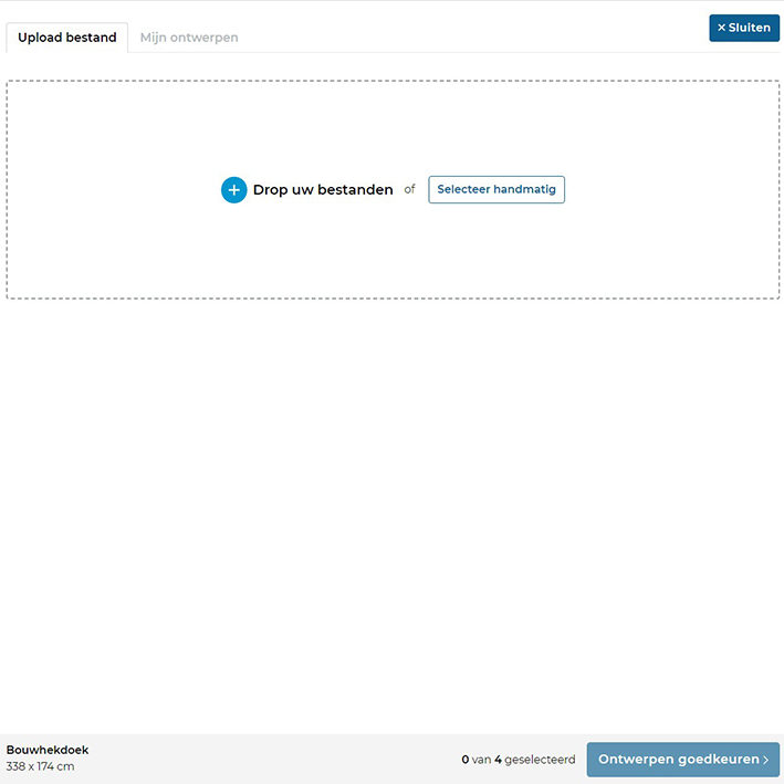 Je klikt op de blauwe knop “ontwerpen toevoegen” waarna er een veld open klapt waar de reeds verwerkte bestanden te zien zijn.