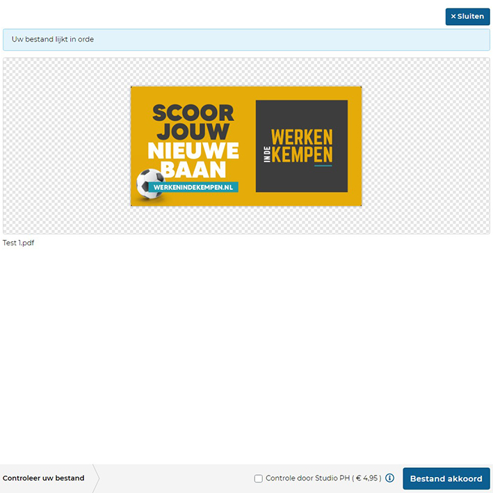 Indien jouw bestanden voldoen aan de juiste aanleverspecificaties zal jij geen foutmelding krijgen. Je krijgt dan nog een preview te zien maar daarbij de melding dat jouw bestanden in orde zijn.