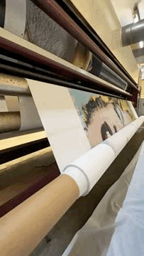 Nadat deze materialen geprint zijn gaan deze nog door een kalander. Een kalander is een machine waar een met olie verwarmde trommel in hangt. Deze zorgt ervoor dat het oppervlak ongeveer 200 graden is. Het materiaal gaat in ongeveer 60 seconden over deze trommel.