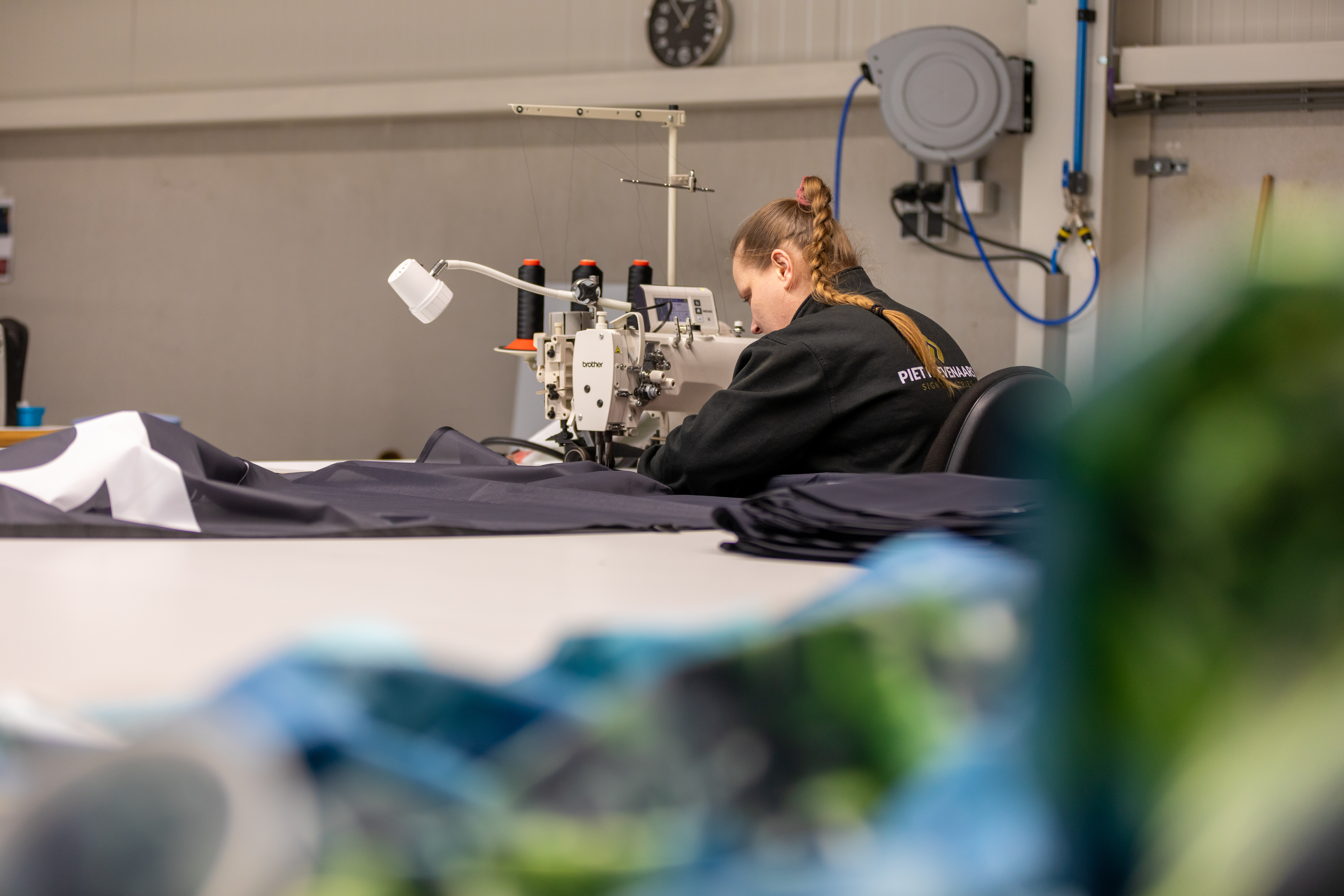 Peesdoeken worden voorzien van pees en treklusje, terwijl vlaggen worden gestikt met tunnels, band en haken. Alles wordt nauwkeurig gecontroleerd voor een strak eindresultaat.