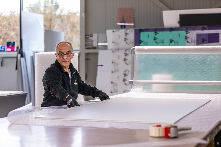 Na het snijden of frezen voeren we een volledige kwaliteitscontrole uit. We controleren onder meer op snijprecisie, kleurconsistentie en materiaalfouten. Sommige prints krijgen daarna nog een aanvullende afwerking, zoals dubbelzijdige tape, staanders of zelfklevende ezels.