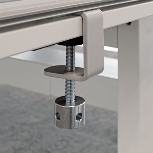 De divider is gemakkelijk op het bureau te monteren met de bijgeleverde tafelklemmen. Deze klemmen zijn geschikt voor alle bureaus met een maximale bladdikte van 4 cm. Met de verstelbare stop zorg je gemakkelijk voor een stevige montage. Het leunt niet op het bureau, maar er zit een kier van ongeveer 1 cm waardoor kabels gemakkelijk onder het scherm verwerkt kunnen worden.