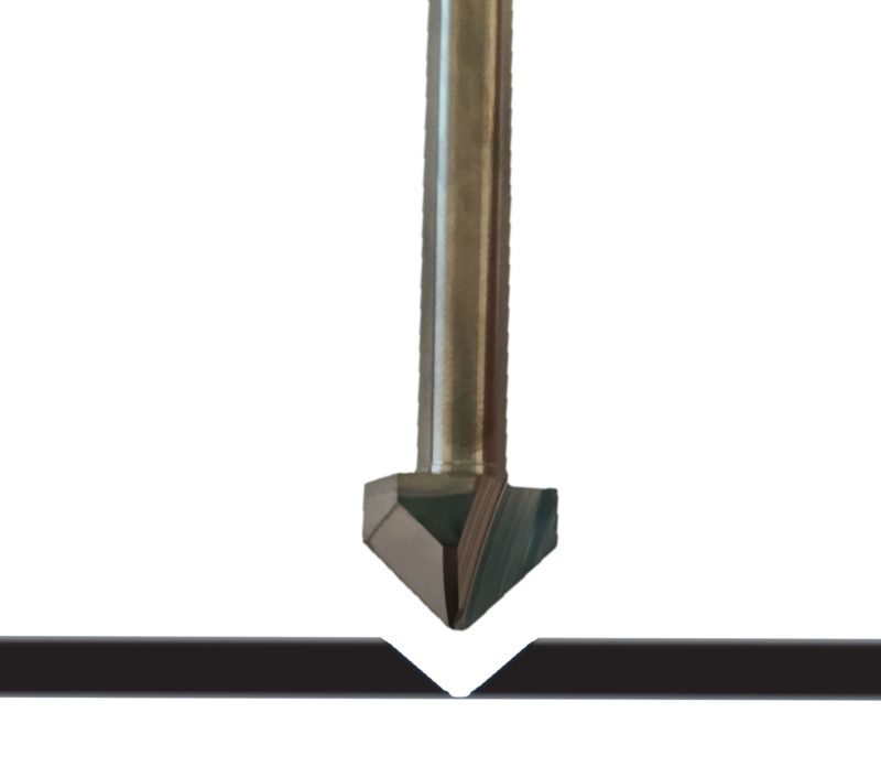 Daarnaast is het mogelijk om Dibond te vouwen in een hoek van 90 graden. De panelen worden dan aan de achterzijde of voorzijde voorzien van een freeslijn. Dit gebeurt met een frees met 2 schuine zijdes van 45 graden. Op deze manier kunnen we een opening van 90 graden frezen, waarmee we het Dibond kunnen vouwen in een hoek.